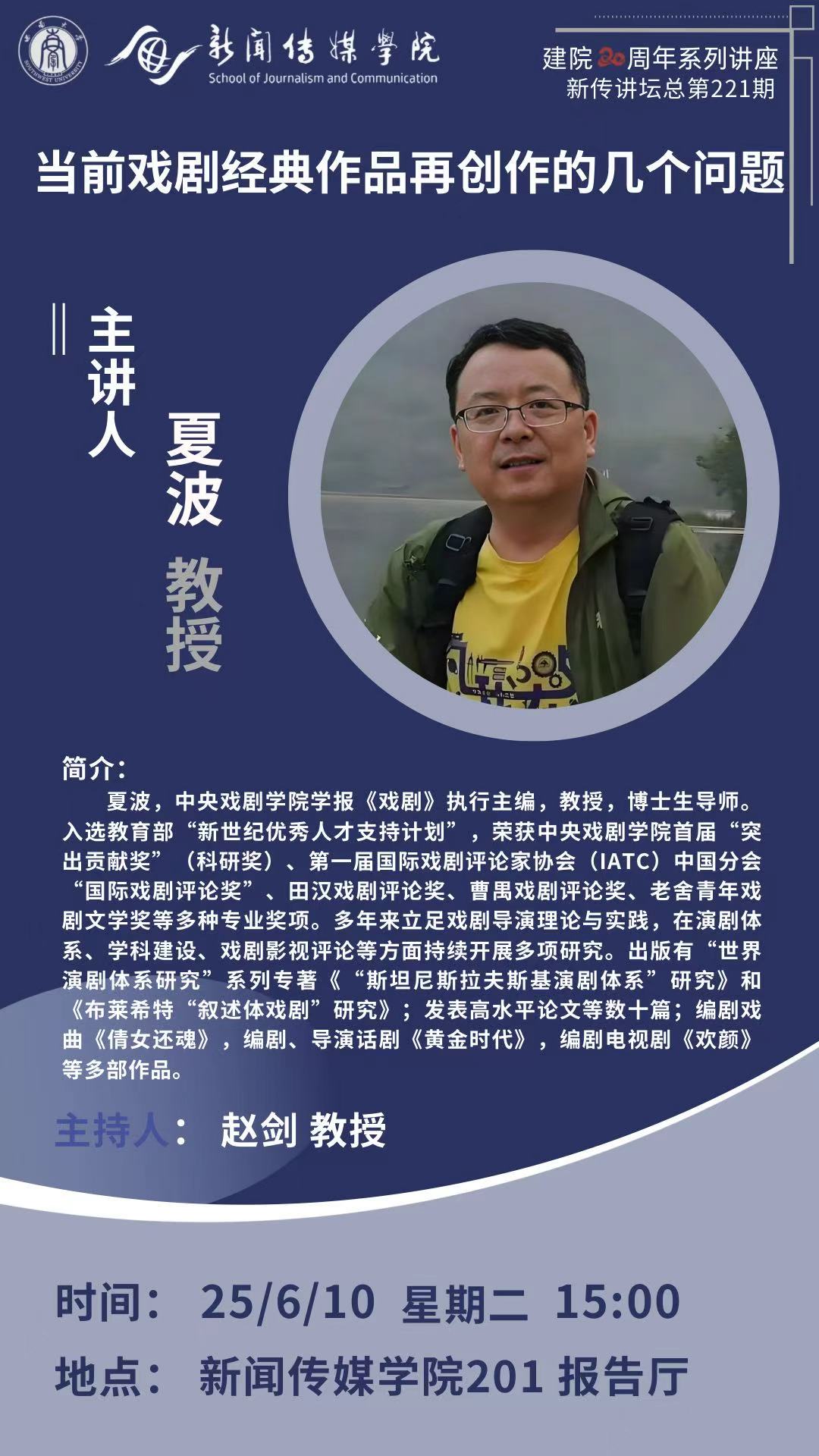 建院20周年系列讲座 | 新传讲坛总第221期 | 夏波:当前戏剧经典作品再创作的几个问题