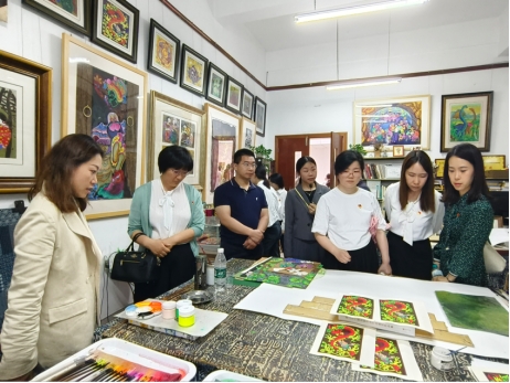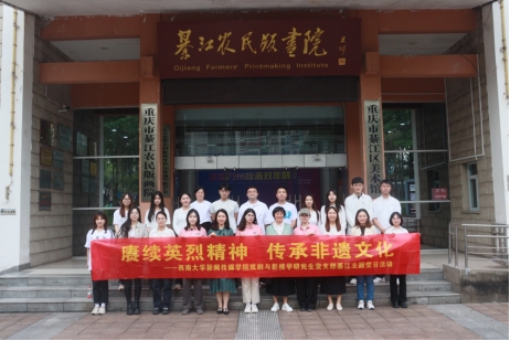 非物质文化遗产的传承发展是传承、发展、提升农耕文明和走乡村文化兴盛之路的重要途径。习近平总书记强调:“要让活态的乡土文化传下去。”綦江农民版画就是一种生动的“活态乡土文化”,起创作多取材于农民群众的生产生活实践,具有浓郁的民族风情和生活气息,綦江先后有上千人参与到农民版画的创作中,共创作出2000余幅作品,是重庆市非物质文化遗产和对外交流的文化名片。走进綦江农民版画院,一幅幅色彩艳丽、质朴自然的农民版画让支部成员赞叹不已,支部党员还在画家工作室观摩并体验了版画的创作流程,从版画题材和风格的变迁中挖掘出不同时代下农民的物质生活水平和精神文化风貌,并对民间艺术、乡村美育、文化传承在新时代的发展进行了讨论。