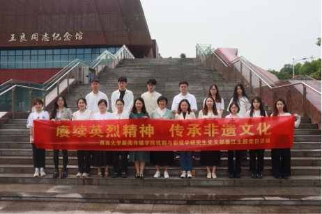 为进一步深化党员思想政治教育,引导支部同志坚定理想信念、继承革命传统,4月29日,新闻传媒学院戏剧与影视学研究生党支部赴綦江开展以“赓续英烈精神 传承非遗文化”为主题的党日活动。学院党委副书记、纪委书记邓永利,学院党委组织员胡文渊,戏剧与影视学研究生党支部书记汤天甜带队参加。