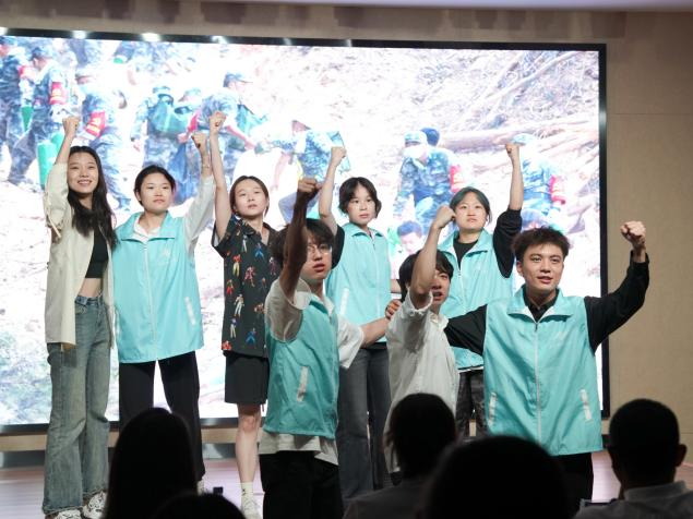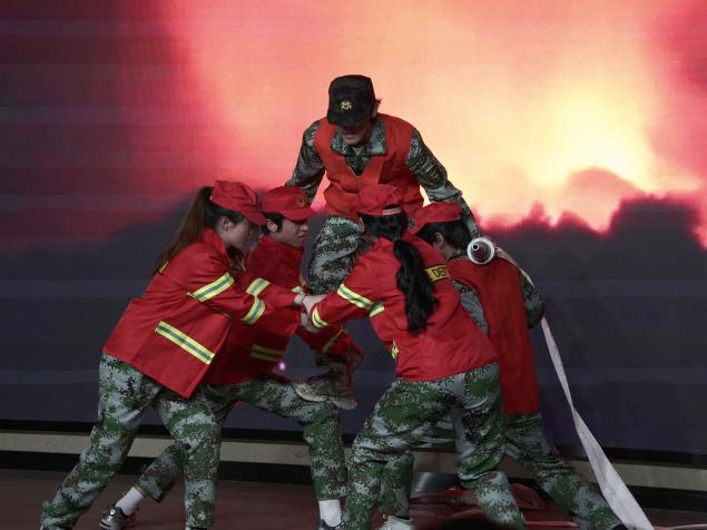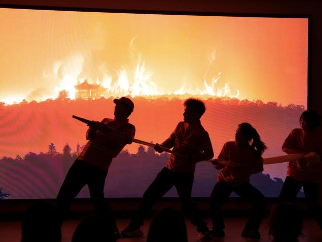 在点评环节,重庆市话剧院国家二级编剧、导演王宏亮对同学们的表现和思政课堂的举办给予了充分肯定,同时对就同学们在表演过程中出现的台词、表演技巧等问题进行了专业性的点评。重庆广播电视集团主持人郎玉茜则表示,自己在同学们的身上看到了共情的能力和传播的力量,她勉励同学们带着这份力量勇往直前。展演剧目《星火长城》是一部以2022年重庆北碚山火为蓝本的现实主义作品,通过讲述消防官兵、干部群众和志愿者们在山火救援中的感人故事。本次思政大课,四组同学用不同的艺术表达方式演绎了《星火长城》剧目,以不同视角、不同重点讲述了山火救援中的场景。