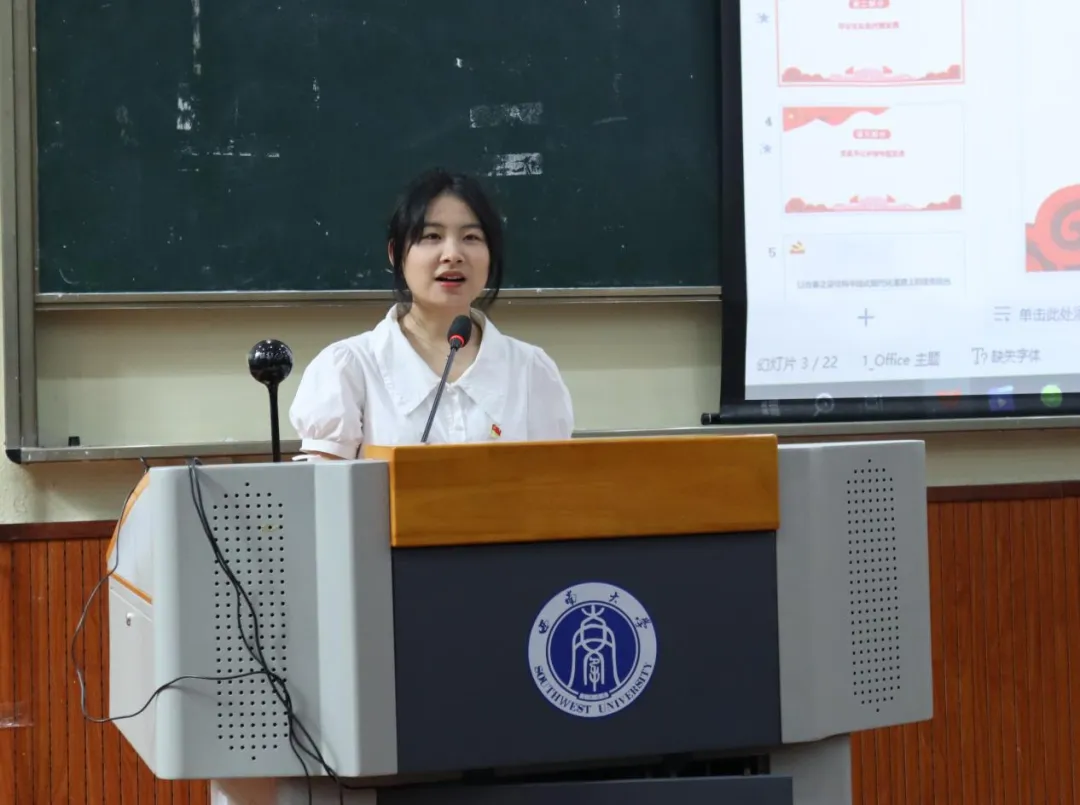 毕业生党员代表进行发言交流。本科毕业生党员杨志远以“赓续红色血脉,青年时代担当”为题,讲述了在新闻理想和红色信念感召下,投身理响青年把“万卷书”读薄、参与红色寻访把“万里路”走实、深入红岩研学把“次元壁”打通的成长历练过程。研究生毕业生党员代表陈美奇讲述用初心点亮前行、用实干丈量成长的三年研究生充实生活,身份在学生会成员、党务助理、党支部副书记、兼职辅导员、媒体实习生中交叉切换,但始终不变的身为青年党员的责任与担当,并号召全体毕业生党员牢记总书记嘱托,用脚步丈量祖国大地,用眼睛发现中国精神,用耳朵倾听人民呼声,用内心感应时代脉搏,坚定新闻理想,坚守初心使命,在奋进新征程中不断发光发热。