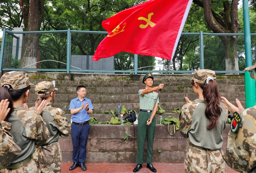 随后,学院院长龙伟向连长徐超授连旗。并由2025级播音与主持艺术专业的康洪崧同学带领全体参训学员宣誓。