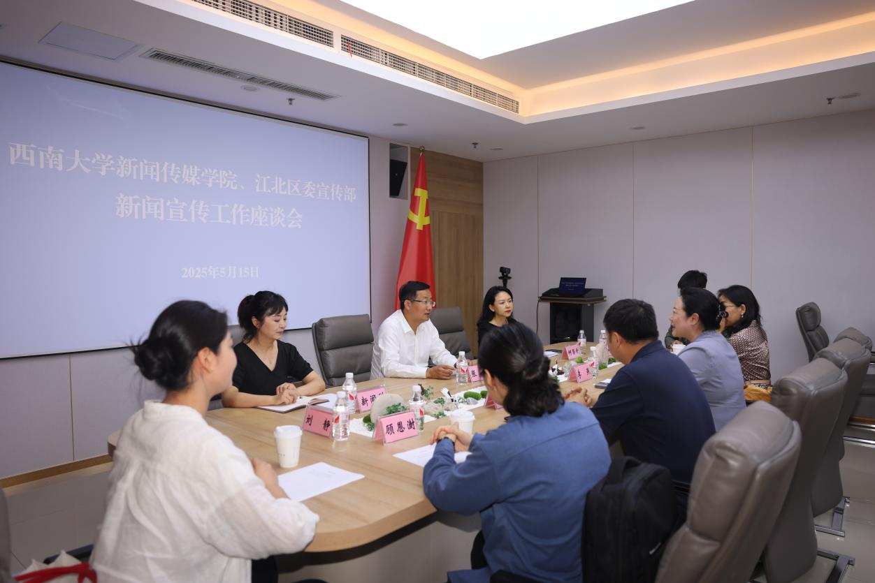 为深化校地合作,探优化高校新闻传播人才培养模式,5月15日,新闻传媒学院党委书记李燕率队前往江北区委宣传部调研交流并开展访企拓岗,学校图书馆党委副书记、纪委书记副馆长(兼)秦红雨教授、张华教授、顾恩澍老师、郭志聪老师参加。江北区宣传部常务副部长张弛等领导陪同并参加座谈交流,双方围绕新闻宣传工作实践、人才培养与就业实训等展开深入探讨。