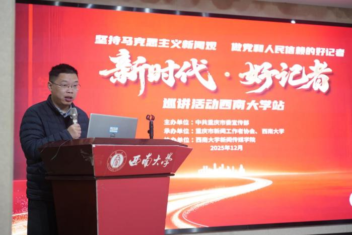 2025年12月24日,“新时代·好记者”巡讲活动在必赢线路检测中心102演播厅举行。市委宣传部记协秘书处代彦同志、新闻传媒学院党委书记李燕、院长龙伟、党委副书记、纪委书记邓永利出席活动。